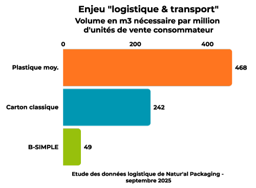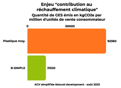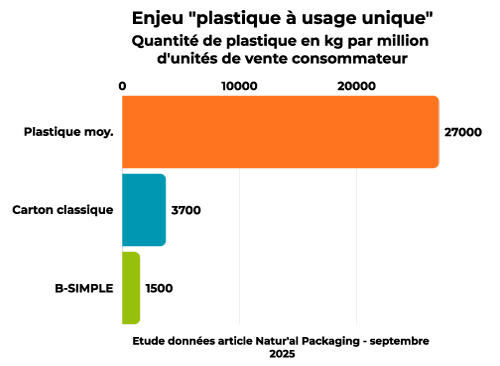 B-SIMPLE Skin, est associĂ© Ă  une structure Ă©co-conçue unique : un support carton recyclable (plus de 90 % carton) permet une rĂ©duction de plastique de 60 % par rapport Ă  une barquette carton classique (grĂące Ă  un film beaucoup plus fin) et limite l’impact climat de 77% (par rapport Ă  une barquette plastique classique).